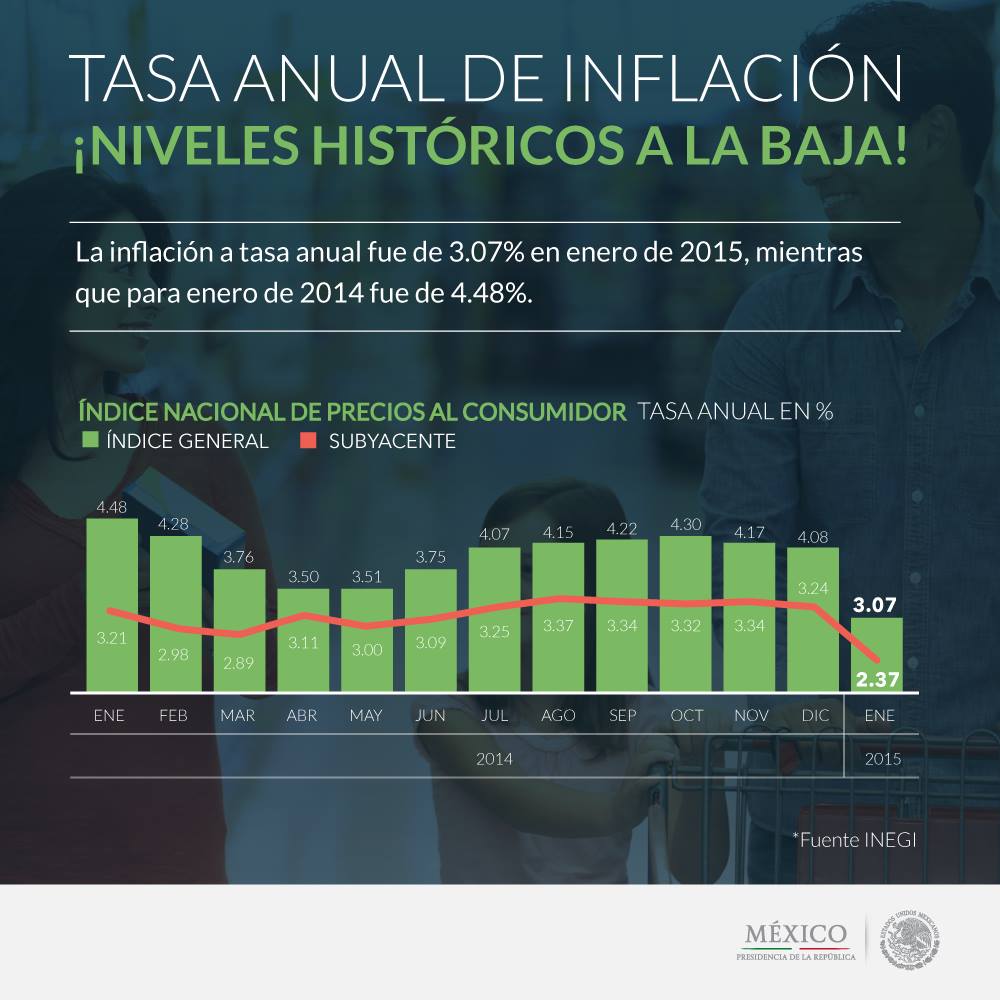 La tasa de inflación anual registró niveles de 3.07%, muy por debajo del 4.48% en enero de 2014 #ReformasEnAcciónpic.twitter.com/G2RS4Sfoej