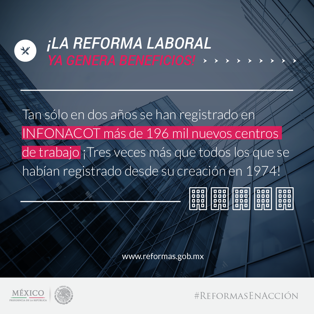 Con la #ReformaLaboral se han registrado en @Infonacot más de 196 mil nuevos centros de trabajo en sólo dos añospic.twitter.com/TAl3238sfC