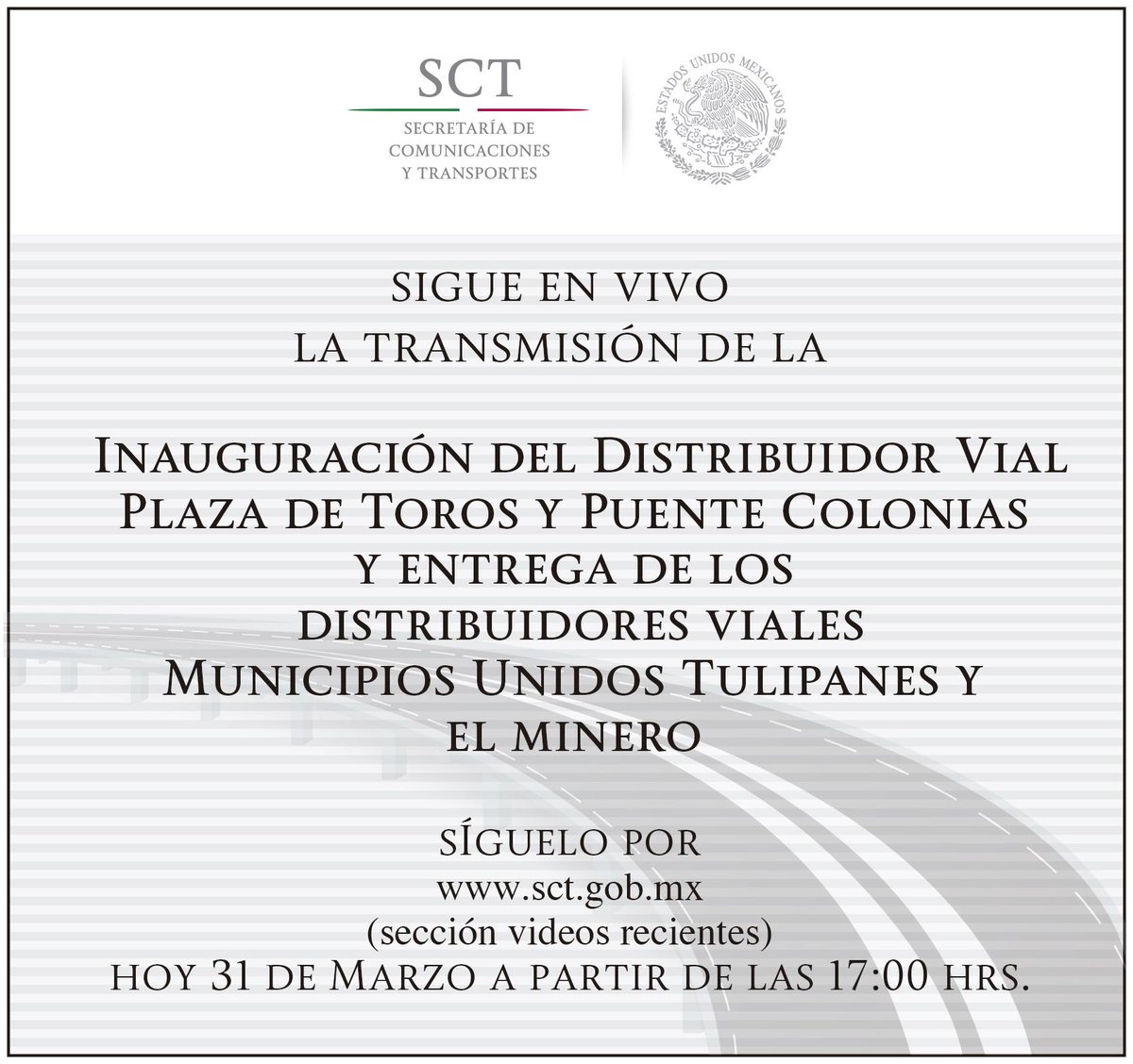Sigue #EnVivo la entrega de diferentes distribuidores viales en Pachuca #Hidalgo. http://sct.gob.mx pic.twitter.com/snZWSiSXgM