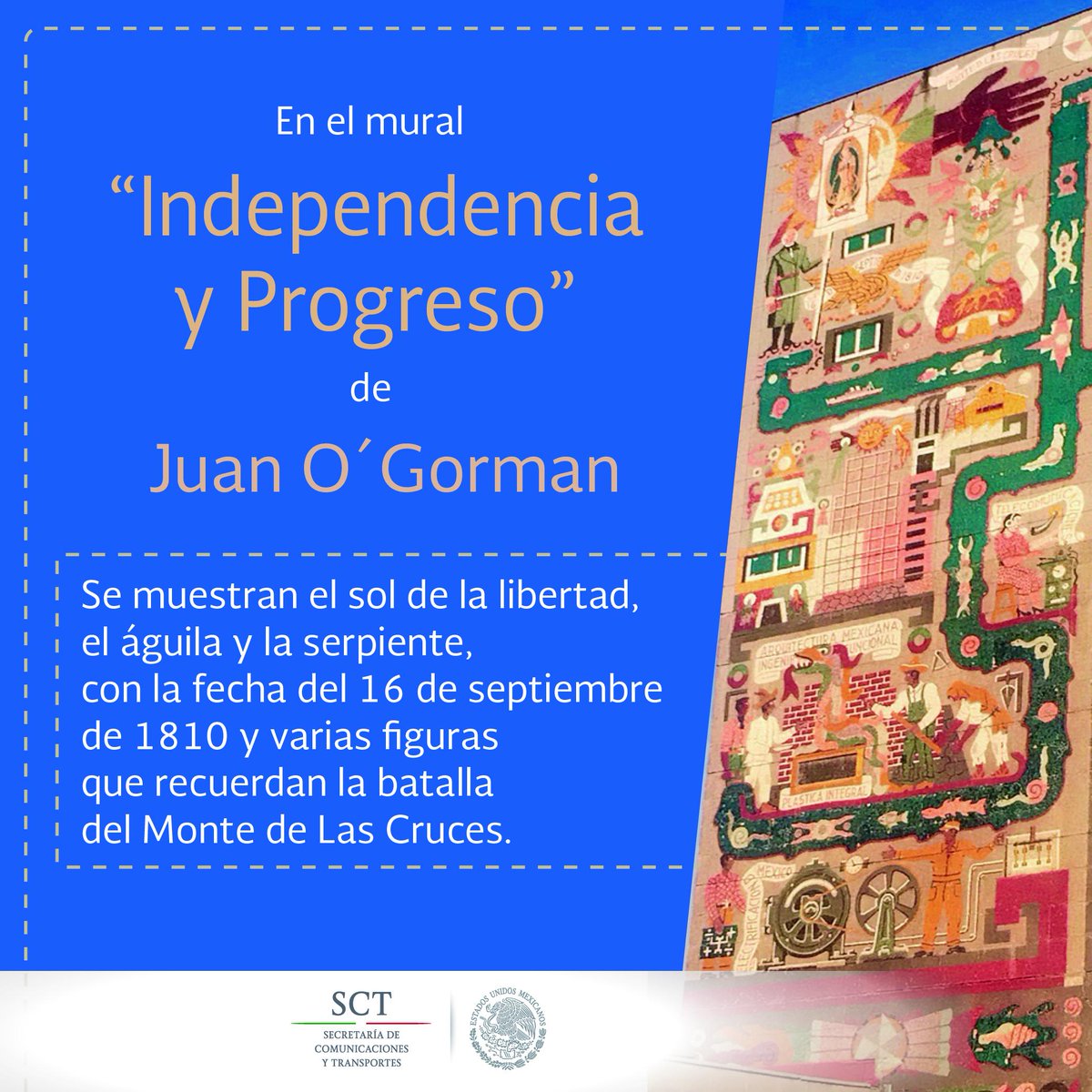 “Independencia y Progreso” de Juan O’Gorman representa la arquitectura, ingeniería y telecomunicaciones #MuralesSCTpic.twitter.com/OYrCTsS7J8