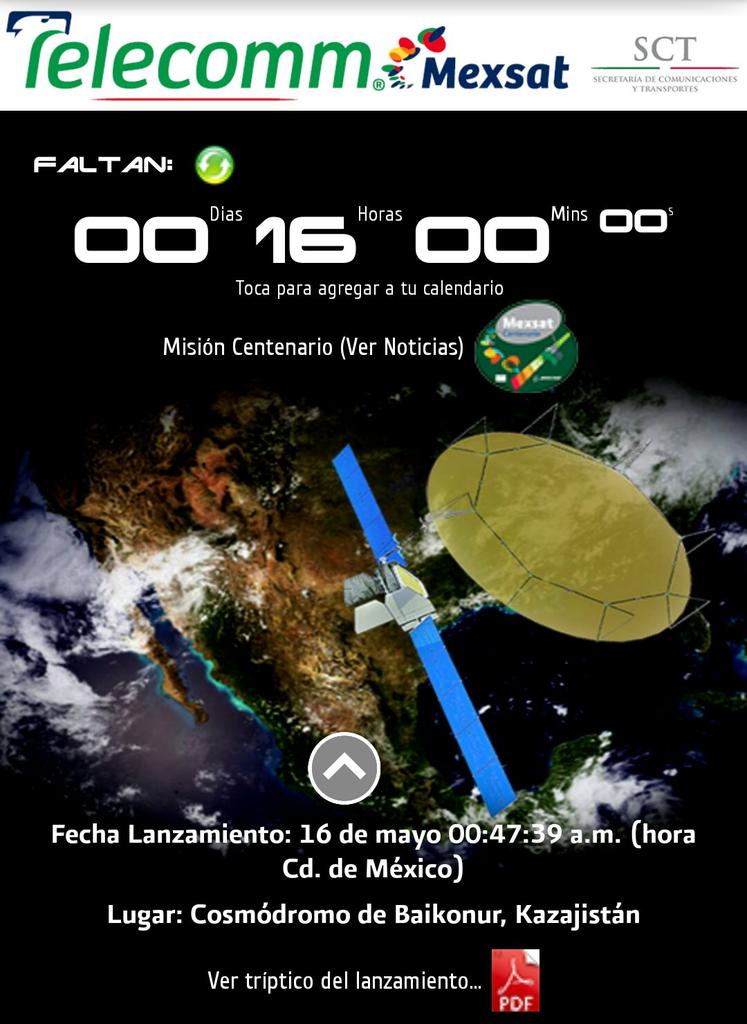 No te pierdas el lanzamiento del #Satélite #Centenario, 16 de mayo 00:47 horas tiempo del centro de #Méxicopic.twitter.com/xPKNxVCYd6
