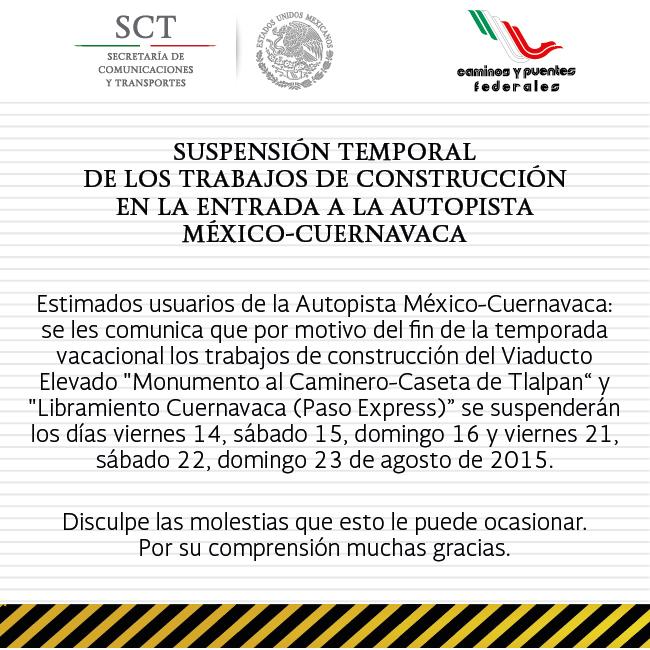 Por fin de temporada vacacional se suspenden los trabajos de construcción en la México-Cuernavacapic.twitter.com/hQm4K0PwOw