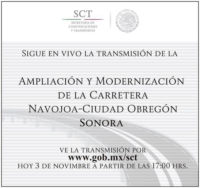 #Agenda: Ampliación y Modernización de la Carretera Navojoa-Ciudad Obregón, 17:00 horas por http://www.gob.mx/sct pic.twitter.com/69pBZ5hANe