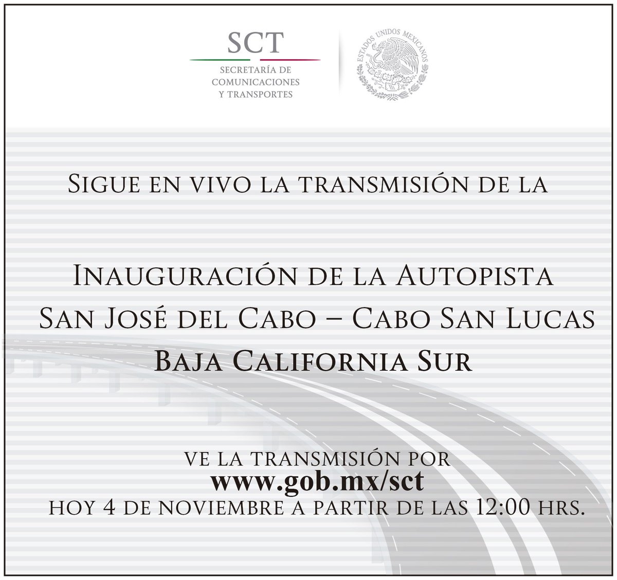 #Agenda: Inauguración de la autopista San José del Cabo-Cabo San Lucas, 12:00 horas por http://www.gob.mx/sct pic.twitter.com/DP6UB9rFO3