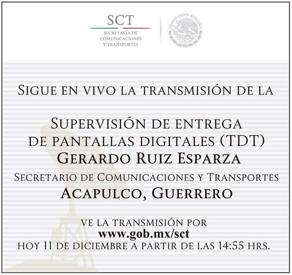 #EnVivo la transmisión del evento "Supervisión de entrega de pantallas digitales #TDT" por http://gob.mx/sct pic.twitter.com/n5vAAlaYov