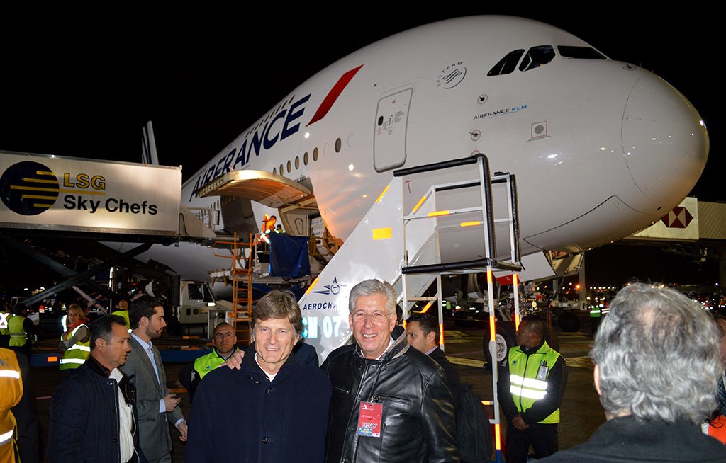 El Srio. @gruizesp, acompañado del titular de @SECTUR_mx, @edelamadrid, a la llegada del #AirbusA380 en el @AICM3pic.twitter.com/1aMa38zH5T