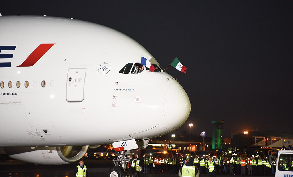 Al son del mariachi, aterrizó el #AirbusA380 por primera vez en el @AICM3. http://ow.ly/X8jIk pic.twitter.com/ZGxqWCve5P