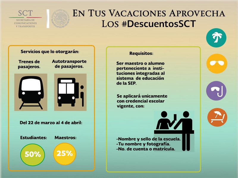 #DescuentoSCT Si eres estudiante o maestro, ¡aprovecha tu descuento en trenes y autobuses! Estos son los requisitos:pic.twitter.com/2ZluRnCx28
