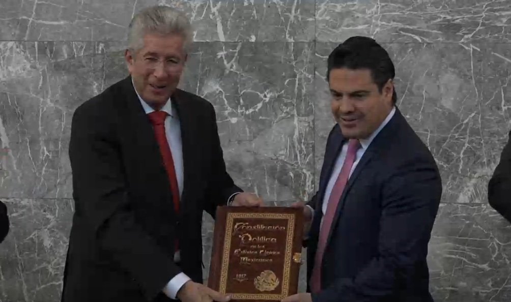 El Secretario @gruizesp entrega el facsimilar de la #Constitución1917 al Gobernador de #Jalisco @AristotelesSD #OrgulloNacional 🇲🇽pic.twitter.com/OLtXO7oV47
