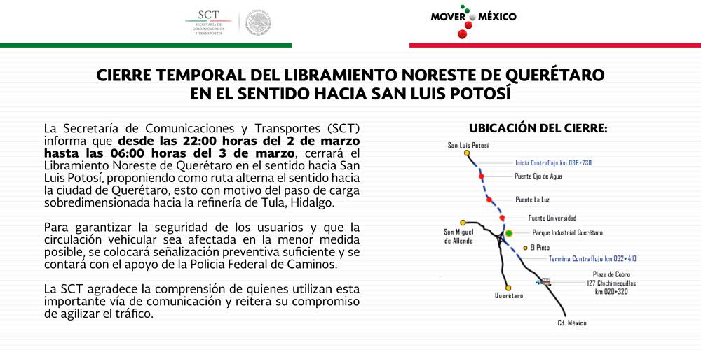 ¡Toma tus precauciones! Cierre temporal de sentido hacia #SLP, hoy a partir de las 10 de la noche, hasta mañana 3 de marzo a las 6:00 am.pic.twitter.com/Y4RcfD2a2e