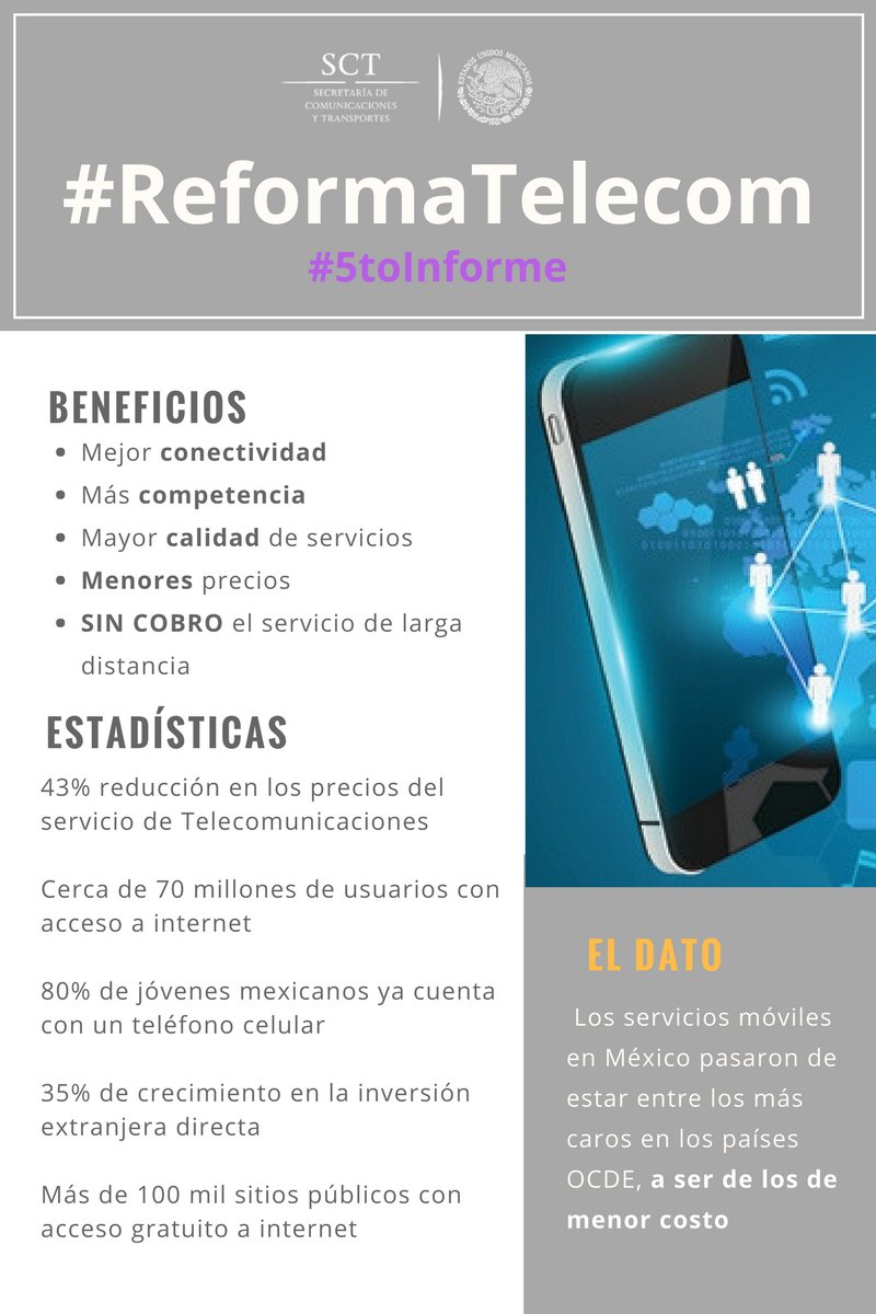 #5toInforme | Con la #ReformaTelecom los precios de los servicios móviles, que incluyen tanto voz como datos, disminuyeron entre 61% y 75%pic.twitter.com/Y3LrKRNdZF