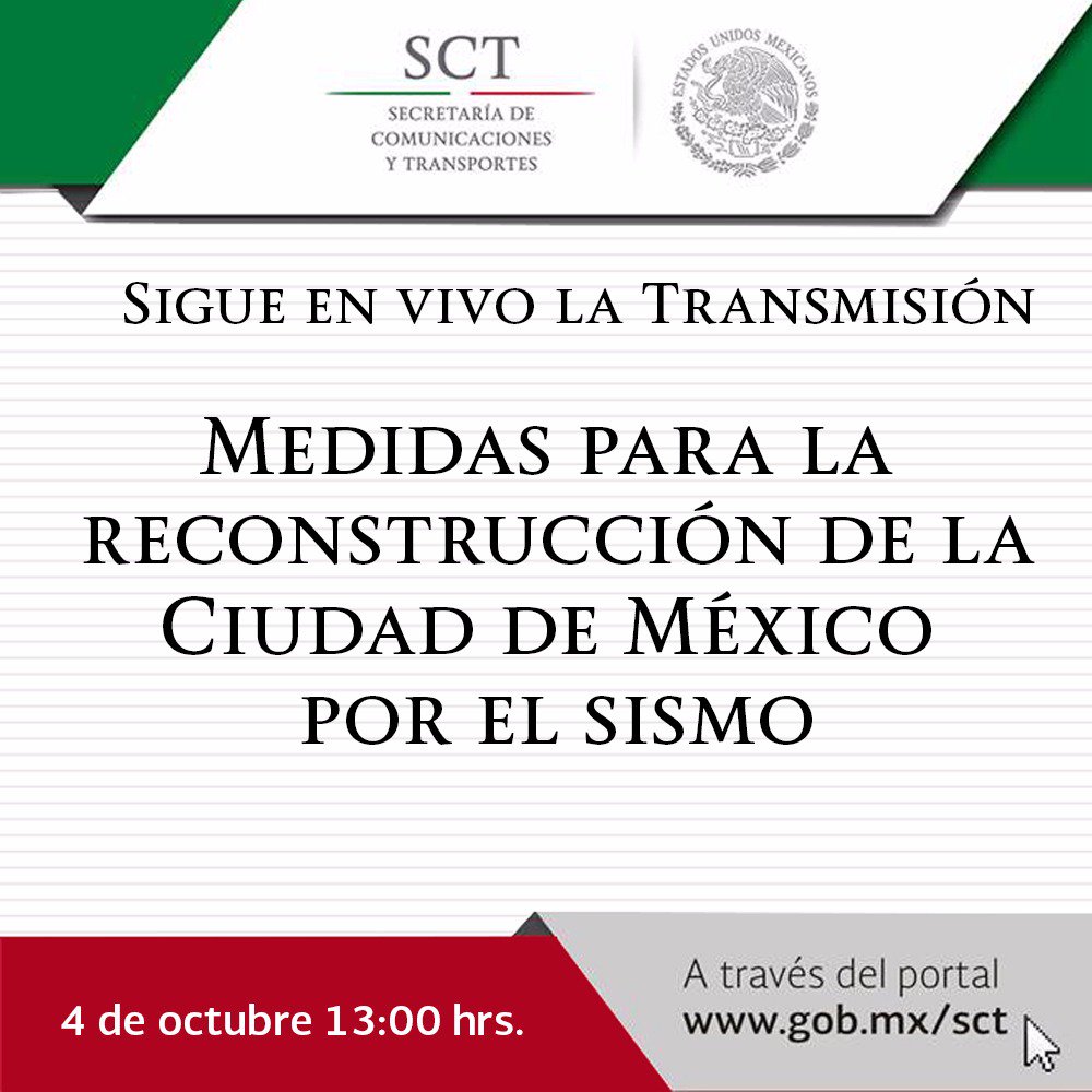 Sigue todos los detalles #ENVIVO sobre las Medidas para la reconstrucción de la Ciudad de México por el sismo http://www.gob.mx/sct pic.twitter.com/JQOA0wfTMY