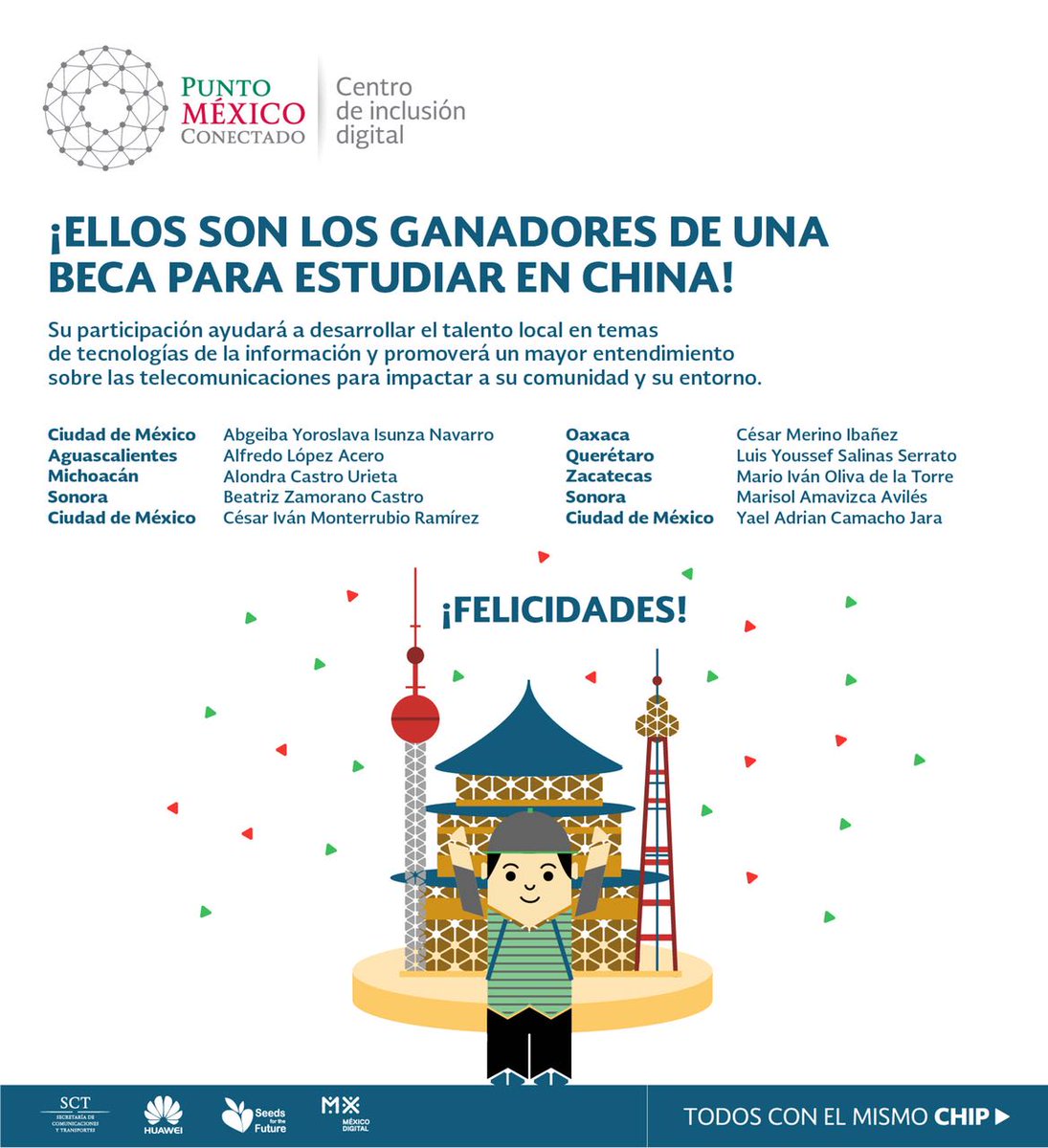 #ComunicadoSCT | Socios de Punto México Conectado ganan beca para estudiar en #China: http://bit.ly/2zqnjKq pic.twitter.com/C6jxe95Y11