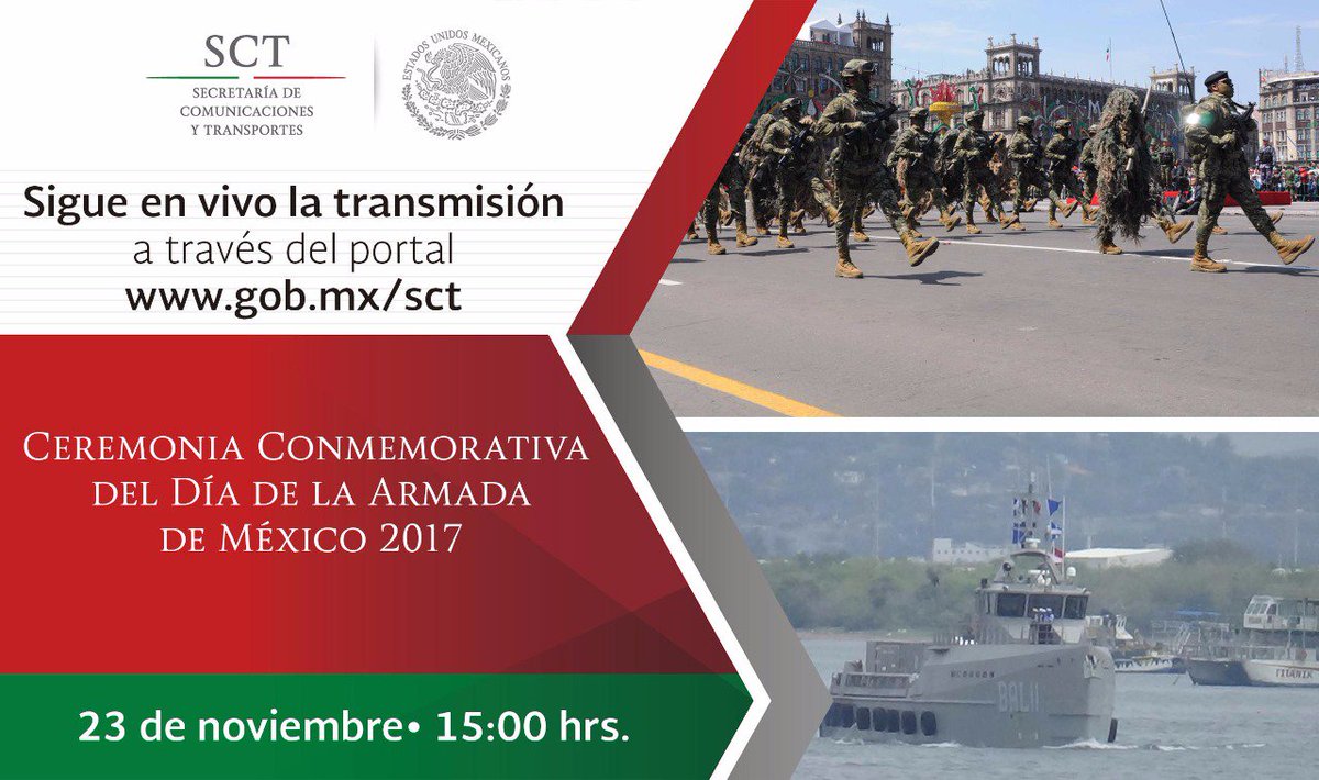 #NoTePierdas la transmisión #ENVIVO de la "Ceremonia Conmemorativa del Día de la Armada de México 2017" a través de nuestro portal: http://www.gob.mx/sct pic.twitter.com/hAf05vygEg