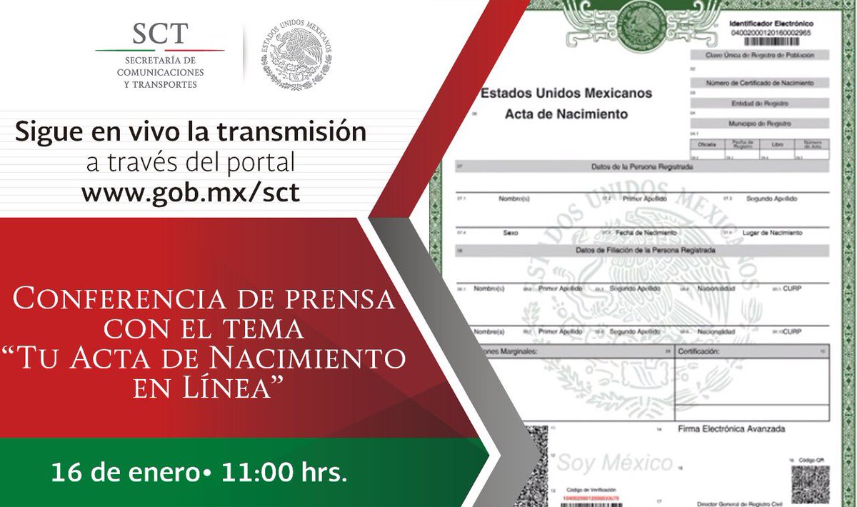 Sigue la transmisión #ENVIVO de la Conferencia de Prensa “Tu Acta de Nacimiento en Línea”, a través de nuestro portal: http://www.gob.mx/sct pic.twitter.com/pSvTrzQa2m