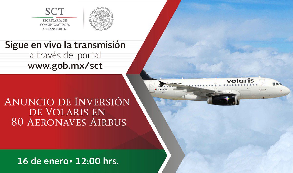 Sigue con nosotros en http://www.gob.mx/sct y no te pierdas los detalles del Anuncio de Inversión de @viajaVolaris en 80 Aeronaves Airbus. |
