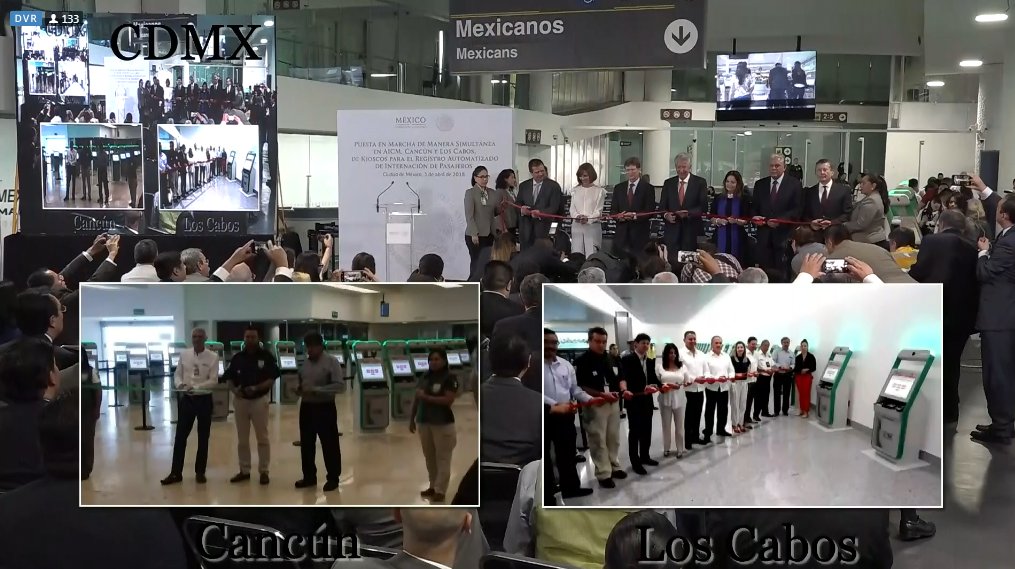 🔴#ENVIVO desde el @AICM_mx | Puesta en marcha de kioscos para el registro automatizado de internación de pasajeros 📸Corte de listón en el @AICM_mx, y también en los aeropuertos de #Cancún y #LosCabos 👏🙌✈️🇲🇽pic.twitter.com/lHmgTVLwYi