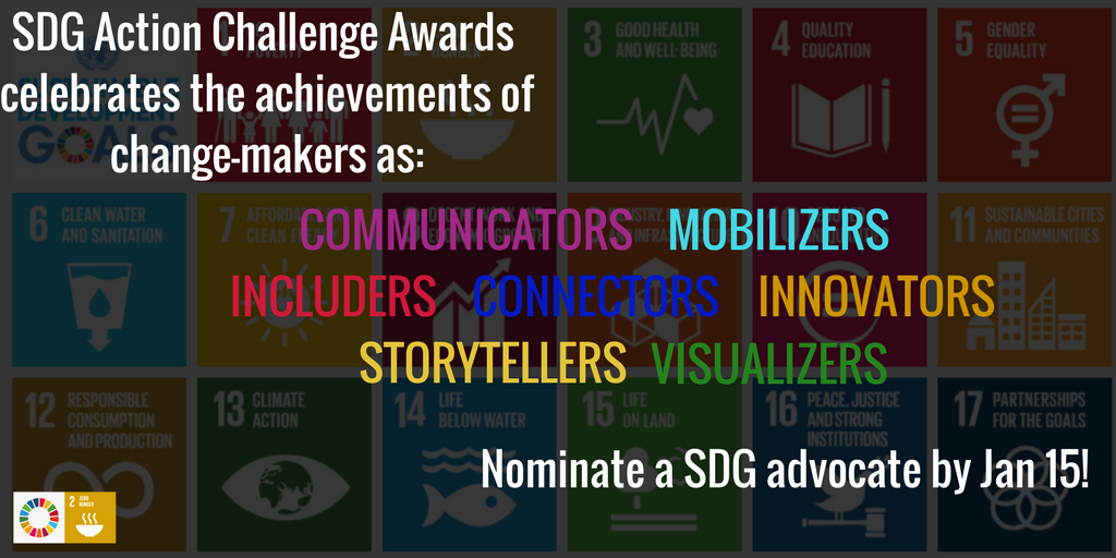 The UN #SDG action challenge awards recognise outstanding achievements and innovative efforts to promote action on the sustainable development goals. Nominate an Advocate by 15 Jan 2018! http://sdgactioncampaign.org/initiatives/sdg-action-challenge-awards/ …pic.twitter.com/DKuToQnbYx