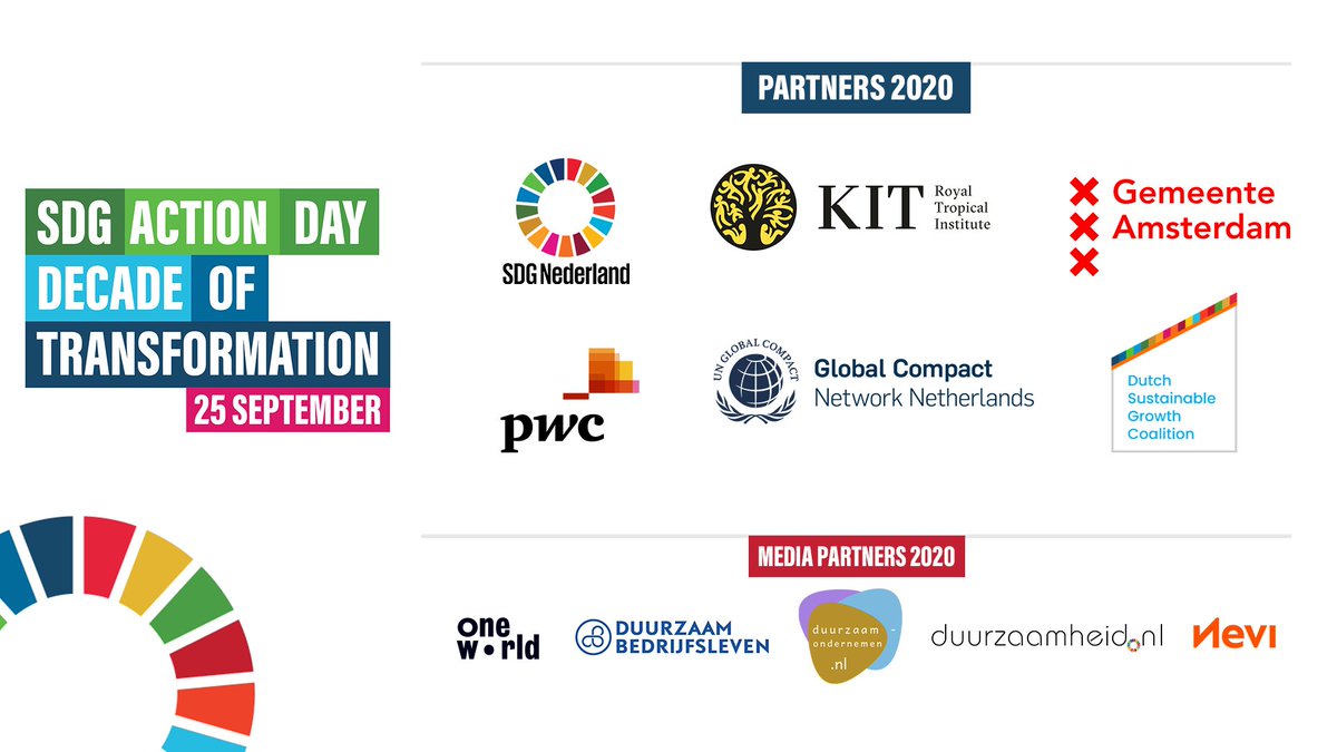 Met partners als @100KIT, @amsterdamNL, @PwC_Nederland, @DSGCoalition, @GlobalCompactNL, @OneWorldNL, @DuurzOndern, @DuurzaamBV, @NEVI_NL en @dzh_nl kan de #SDGActionDay2020 op 25 sept niet anders dan een succes worden. Tickets --> http://sdgactionday.nl . #decadeoftransformationpic.twitter.com/7EktW0Lls2
