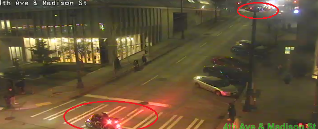 UPDATE: Madison St b/w 4th Ave & 5th Ave is back open. The (2) NB right lanes of 4th Ave b/w Madison and Spring St is closed. Use caution.