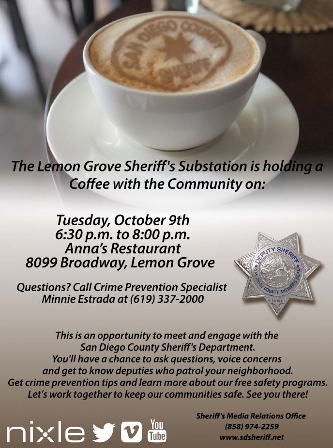 Join us on Tuesday, October 9 from 6:30 p.m. to 8:00 p.m. at Anna's Restaurant (8099 Broadway) for coffee and conversation. For more information, visit http://local.nixle.com/alert/6818244/ pic.twitter.com/mhtosyZ3kU