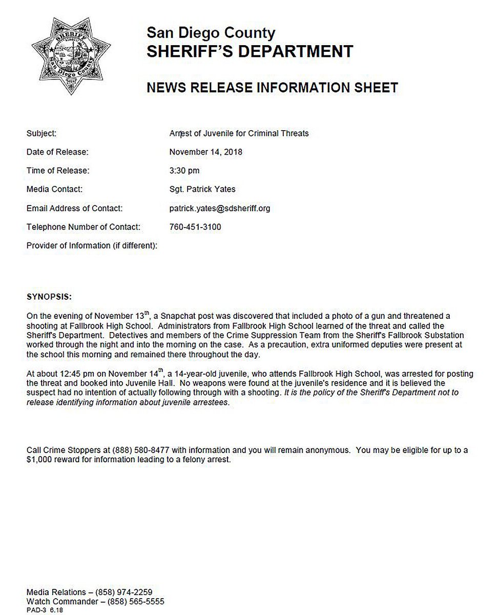 A student was arrested today for making threats against Fallbrook High School @FHSWarriors. @SDSOFallbrook Deputies conducted extra patrols of the campus. You can report suspicious activity by calling the @sdcrimestoppers Students Speaking Out Hotline at (888) 580-8477.pic.twitter.com/M87XVI4MTn