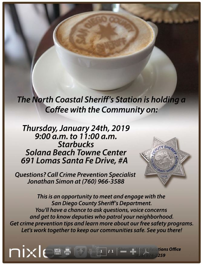 Join us for @SDSheriff Coffee with the Community with @SDSONorthCoast in @CitySolanaBeach on Thursday, January 24, 2019 from 9:00 a.m. to 11:00 a.m. at Starbucks (691 Lomas Santa Fe Drive, #A, at the Solana Beach Town Center). For more info, visit: http://local.nixle.com/alert/7012292/ pic.twitter.com/vay2YADg2T