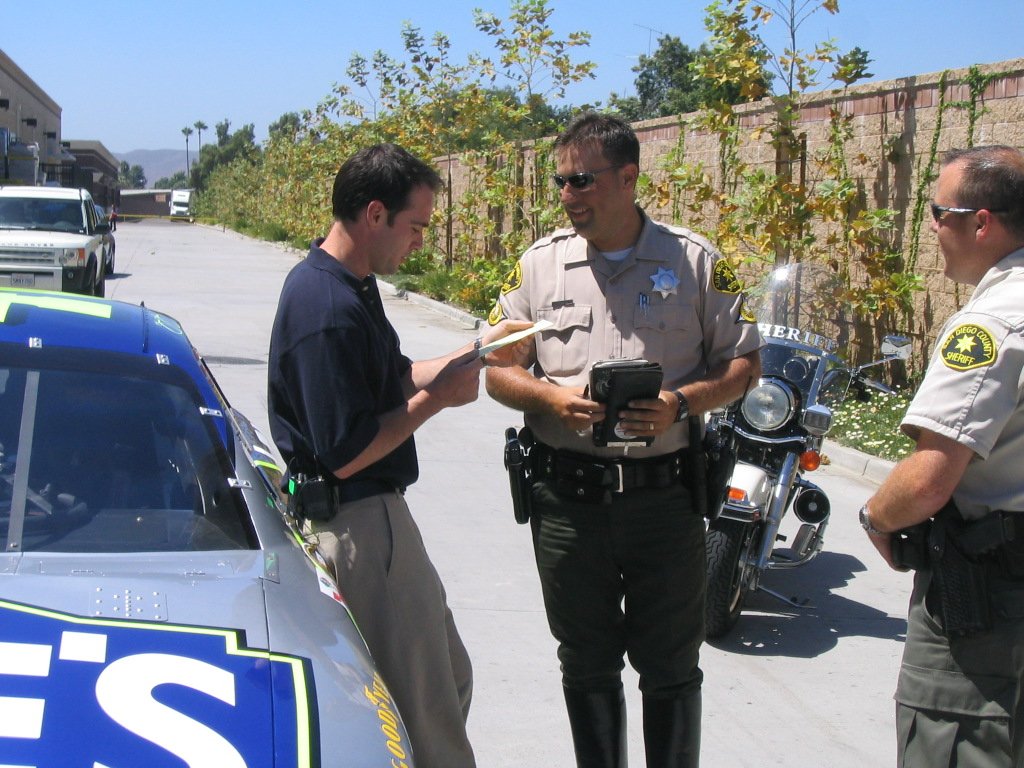 #ThrowbackThursday to 2005 when @NASCAR Driver @JimmieJohnson got a "speeding ticket" from then @SDSheriff Motor Deputy Norton for going 100 mph near @CityofSantee. Of course it was all in good fun. He was a law abiding citizen even signing fan autographs for nearly four hours.pic.twitter.com/vF0sLg1p0a