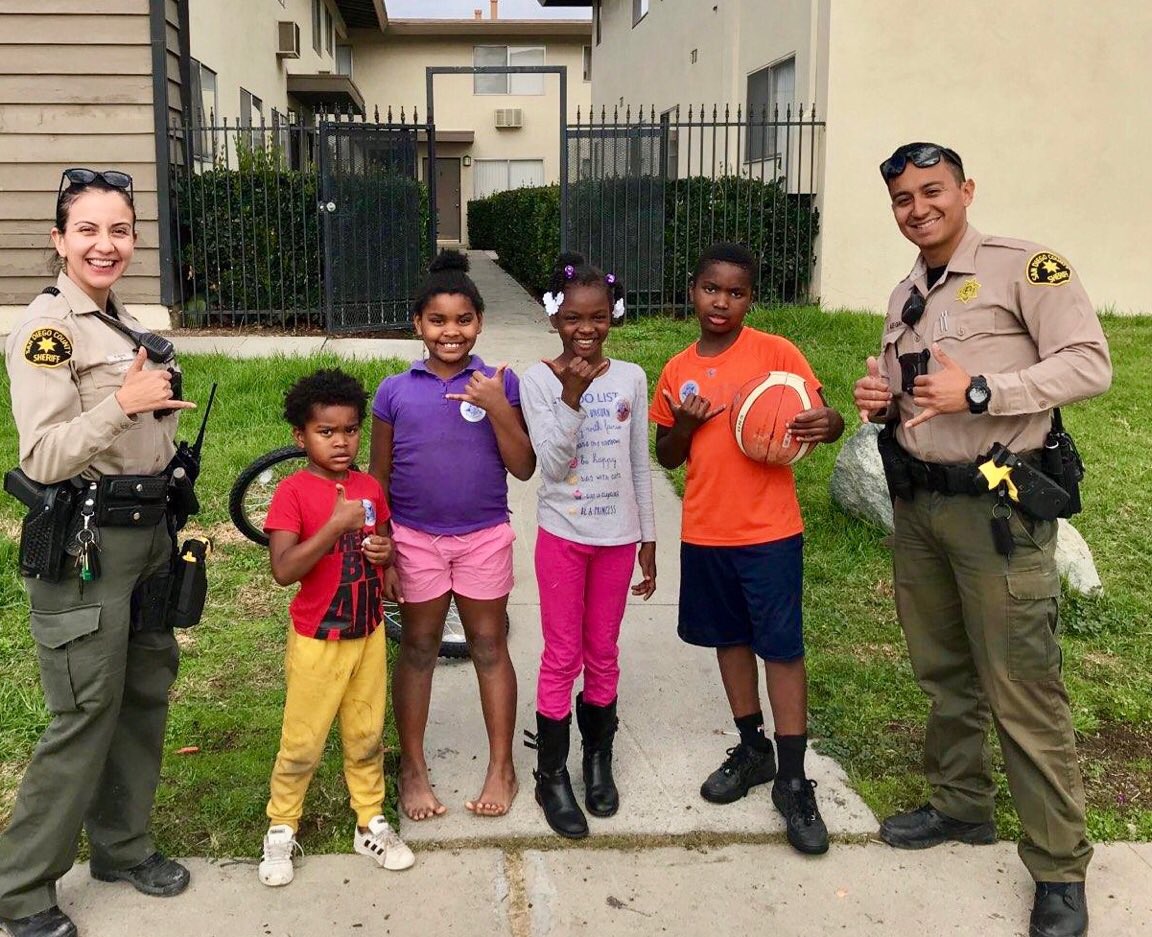 #InYourCommunity Recently, @SDSORSD Deputies White and Alegria met this great group of children in Spring Valley. They spent some time chatting and dribbling the basketball.