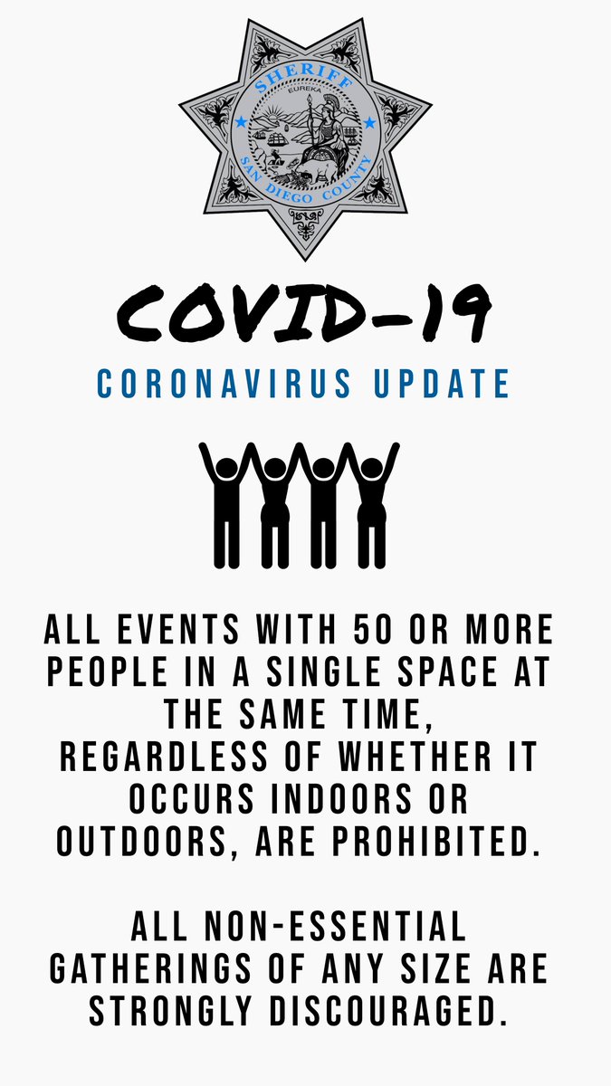A reminder: All public and private gatherings in San Diego County are prohibited under an emergency health order through March 31st to slow the spread of #coronavirus. Learn more on the enforcement of this public health order at https://www.sdsheriff.net/ in the COVID-19 section.pic.twitter.com/wZRuzqPeR5