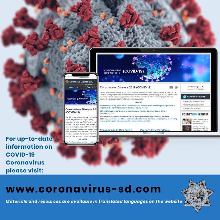 For the latest information on #coronavirus #COVID19 in #SanDiegoCounty, visit http://coronavirus-sd.com . To learn more about what @SDSheriff is doing to keep you safe, visit http://sdsheriff.net .pic.twitter.com/vWyFUfx80f