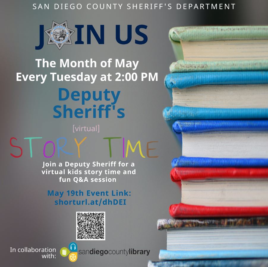 kicks off at 2 PM. Join @SDSOVista Deputy Ector for a reading and Q&A afterwards. To join in on the fun, scan the QR code below or visit: http://shorturl.at/dhDEI . We'll see you at 2 PM.
