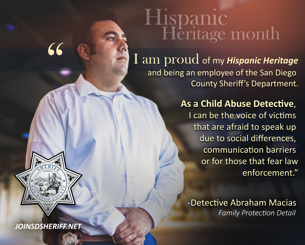 We continue to celebrate #HispanicHeritageMonth. In his own words, @SDSheriff Child Abuse Detective Macias explains how he is able to make a positive difference in the community. http://joinsdsheriff.net pic.twitter.com/g6ESeasrke