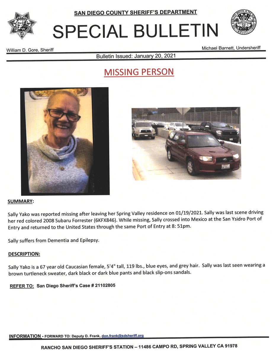 Watch Cmdr: Help us find a missing person from Spring Valley. Sally Yano was last seen driving her red 2008 Subaru Forrester around 8:51 pm crossing into the US from Mexico. Sally suffers from dementia and epilepsy. If you see Sally, you’re asked to call ⁦us at 858-565-5200.pic.twitter.com/LPuJBfvj3E