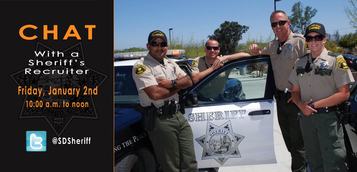 The next @SDSheriff CHAT WITH A RECRUITER is this Friday, January 2nd, from 10AM to noon. http://www.joinsdsheriff.net pic.twitter.com/XTIFFIwj1A