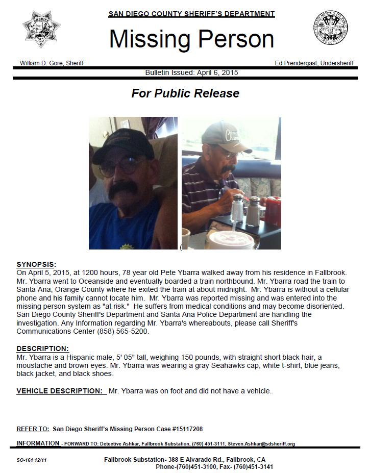 Missing person at risk. 78-year-old Pete Ybarra left Fallbrook home and boarded train to Santa Ana. @SantaAnaPDpic.twitter.com/swmOFDrlOz