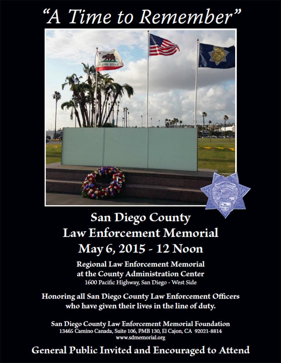 Join @SDSheriff in honoring fallen deputies, officers at SD County Law Enforcement Memorial. May 6. Retweet & share.pic.twitter.com/jLLtYhX1hb