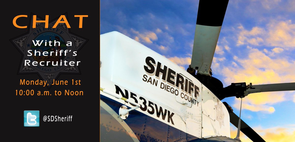 The next @SDSheriff CHAT WITH A RECRUITER is on Monday, June 1st from 10AM to noon. http://www.joinsdsheriff.net pic.twitter.com/pcQ63AwzXF