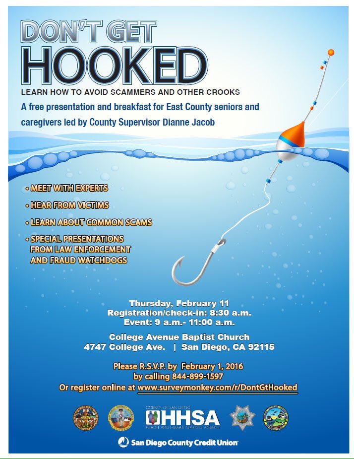 Join @SDSheriff Elder Abuse Unit, @dianne_jacob at "Don't Get Hooked" presentation on Feb. 11. #ScamAlert #BeAwarepic.twitter.com/Woy0nYOMUM