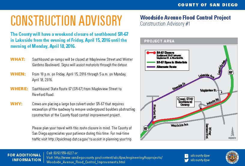 Road closure in Lakeside this weekend. Info: http://goo.gl/XJXrrz . Real time traffic: http://quickmap.dot.ca.gov/ https://twitter.com/sdcountydpw/status/720369791106551811 …