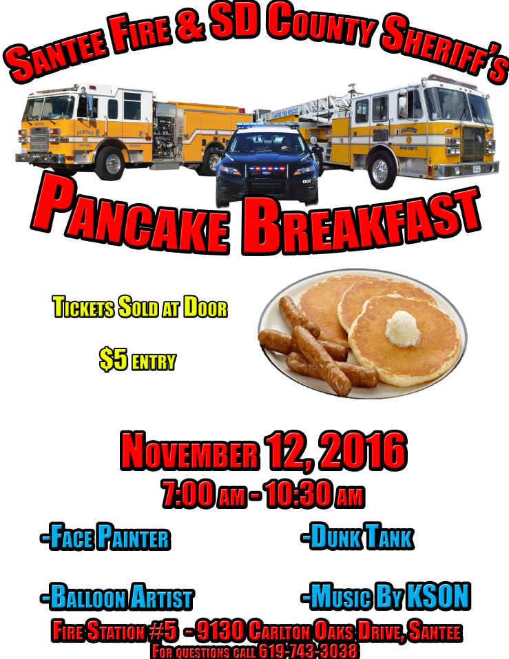 Join @SDSheriff Deputies and @CityofSantee Firefighters at Pancake Breakfast. SAT, Nov. 12. 7AM to 10:30AM. Info: https://goo.gl/fd9qMg pic.twitter.com/j7TycUPOiT