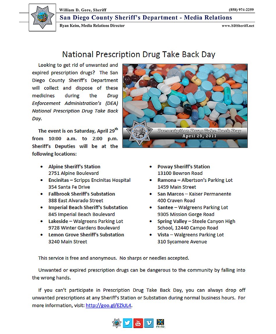 Join @SDSheriff for National Prescription Drug Take Back Day. April 29. 10AM-2PM. Bring your unwanted/expired drugs to these locations.pic.twitter.com/OgKSyGvfIl