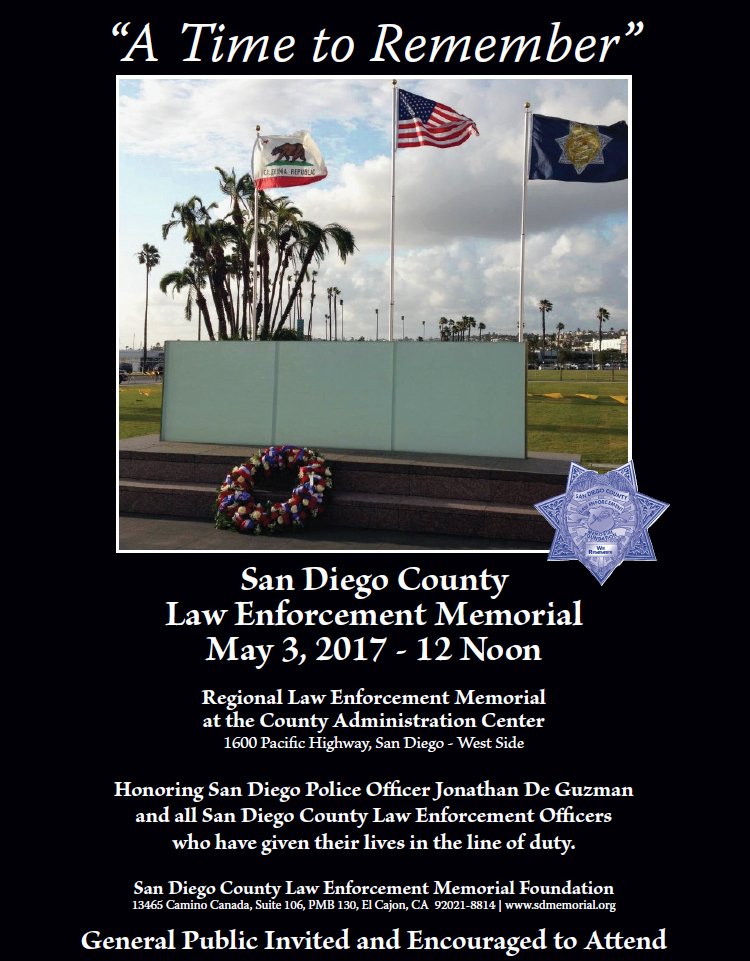 Join us at the San Diego County Law Enforcement Memorial Ceremony on May 3 at NOON. County Administration Center. http://sdmemorial.org pic.twitter.com/TqJxP8FFiS