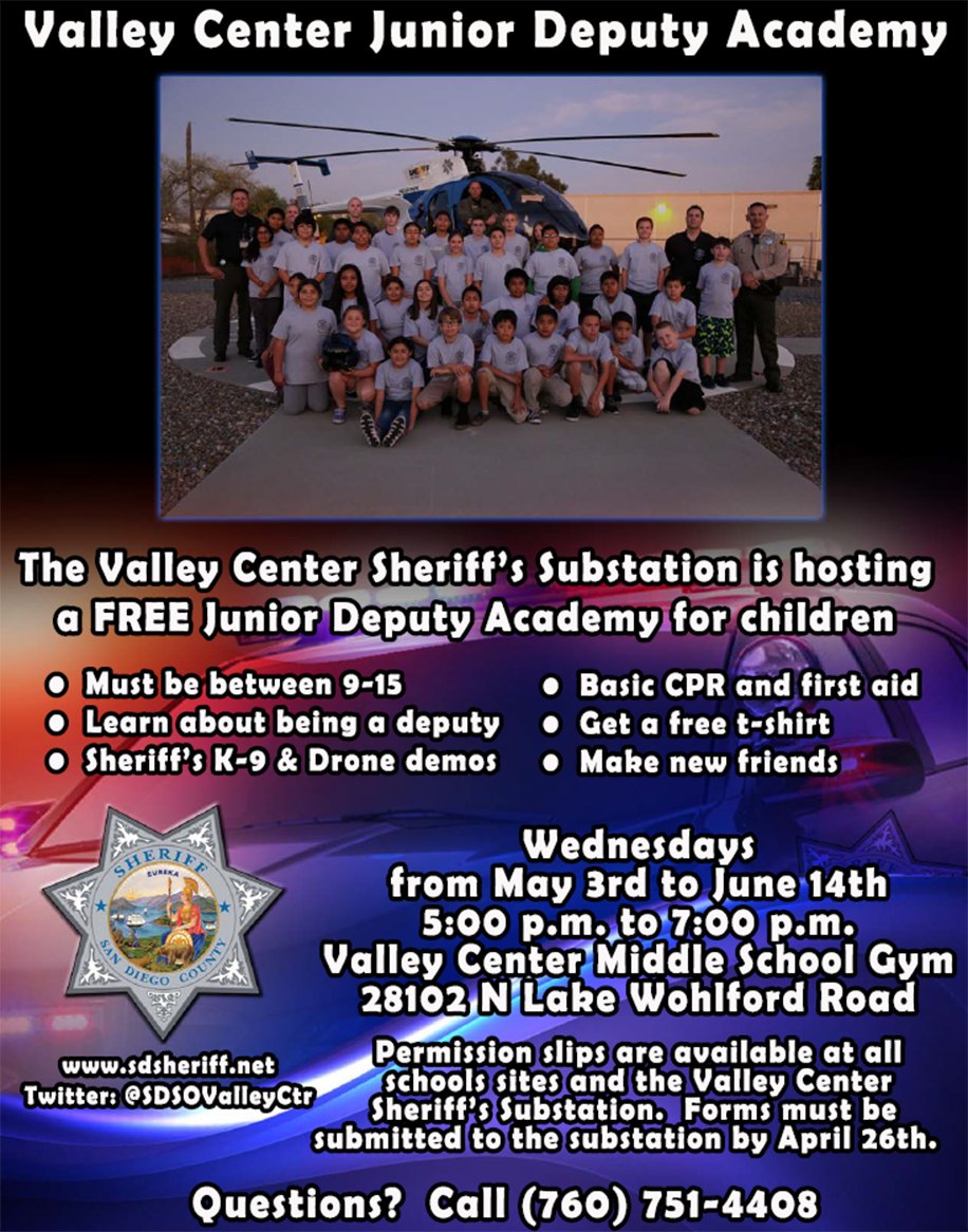 Register your kids for FREE @SDSOValleyCtr Junior Deputy Academy by April 26th. For more Info, click here: https://goo.gl/IMeUmA pic.twitter.com/ms0aIsGr3W