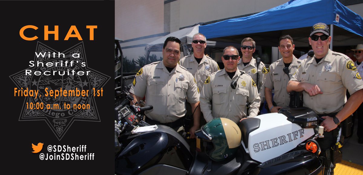 It's time for @SDSheriff @JoinSDSheriff CHAT WITH A RECRUITER. Tweet us your questions until NOON. Apply online at http://joinsdsheriff.net pic.twitter.com/bZzpOZLMPK