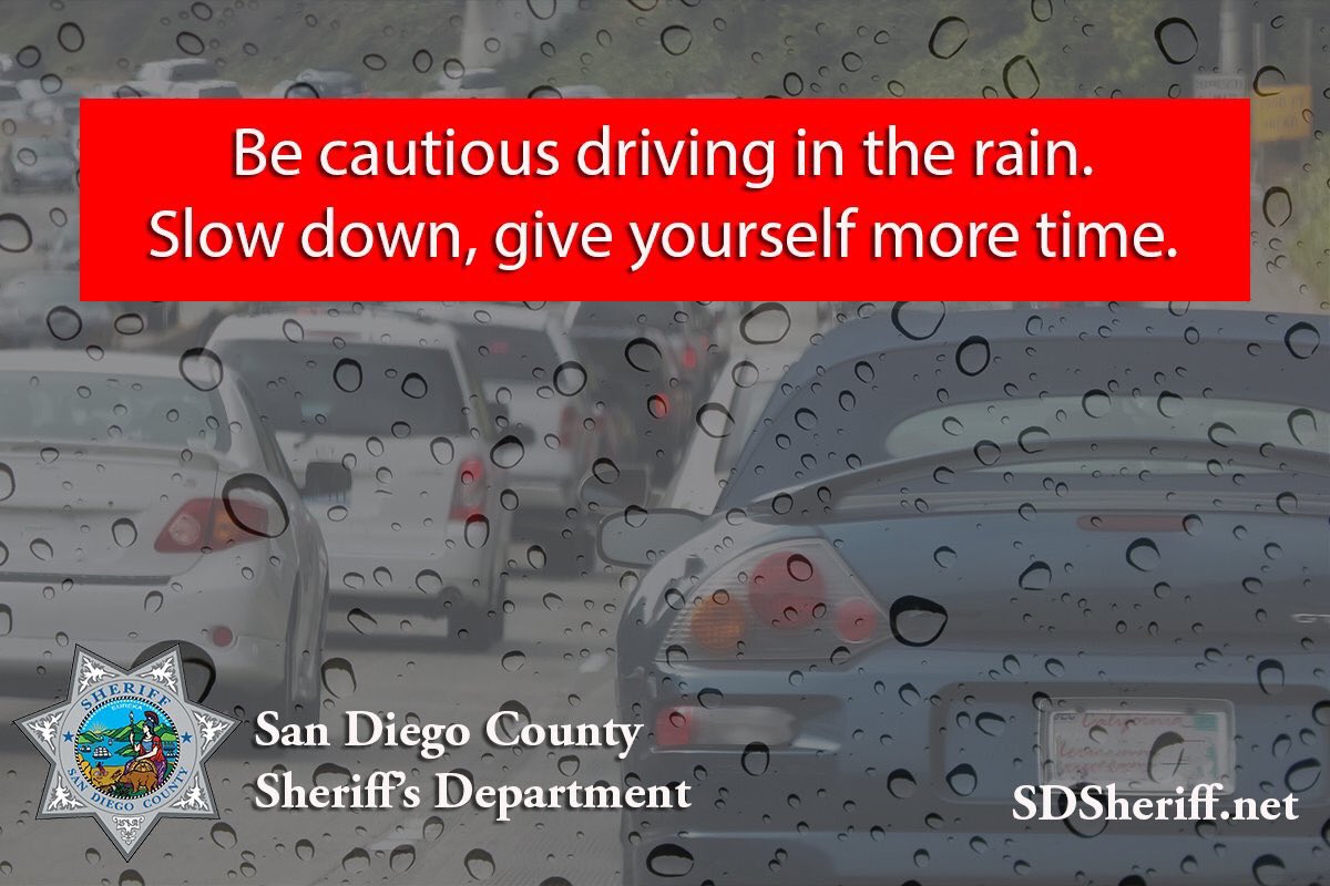 A friendly reminder from @SDSheriff: due to the rain, remember to slow down and give yourself more time while on the road. Stay safe. #SafetyFirst #Rain #WinterStorm #SoCal #DriveSafe #SanDiegoWxpic.twitter.com/C3mTDeIffg