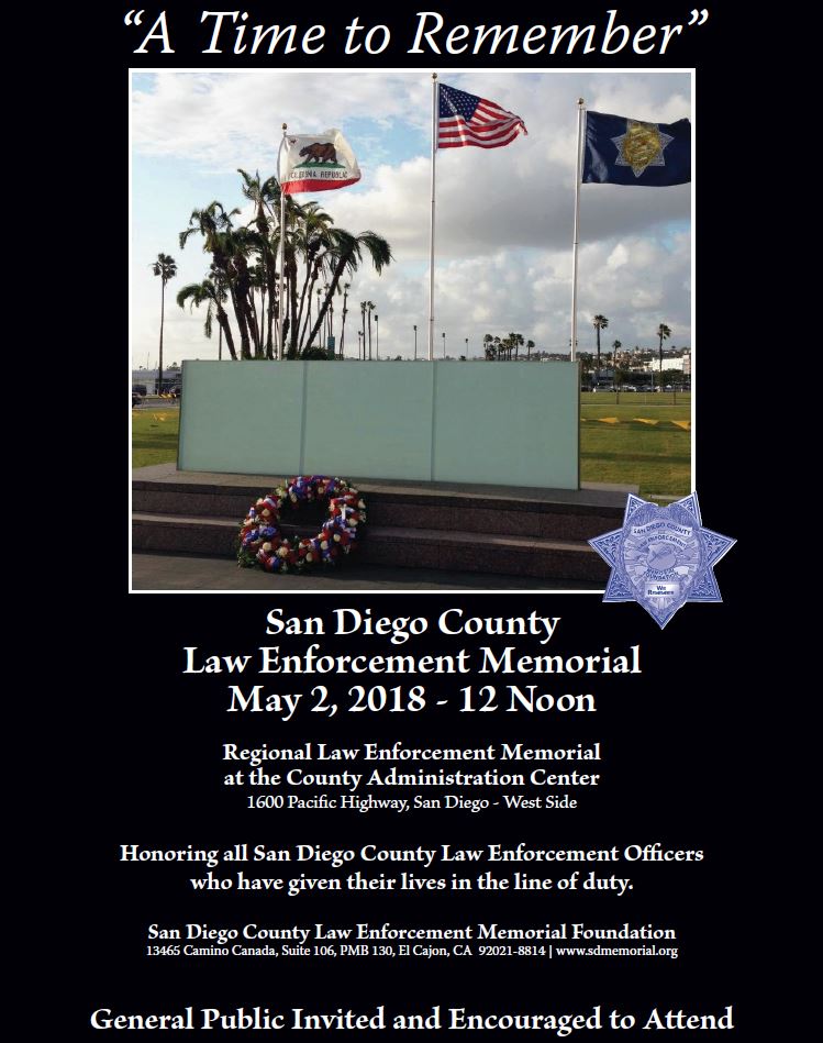 Join us at the San Diego County Law Enforcement Memorial Ceremony on Wednesday, May 2nd at noon at the County Administration Center (1600 Pacific Highway, West Side) along the Embarcadero. Everyone is invited. For more information, visit: http://sdmemorial.org .pic.twitter.com/3rqGdsNW50
