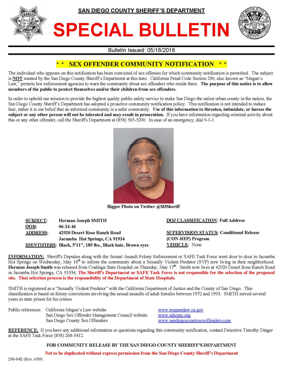 Community Notification for East County. Sexually Violent Predator HERMAN JOSEPH SMITH now living in Jacumba Hot Springs. Deputies went door to door in the community on Wednesday, May 16th. Smith was released from a state hospital on Thursday, May 17th.pic.twitter.com/ieFA52cJYU
