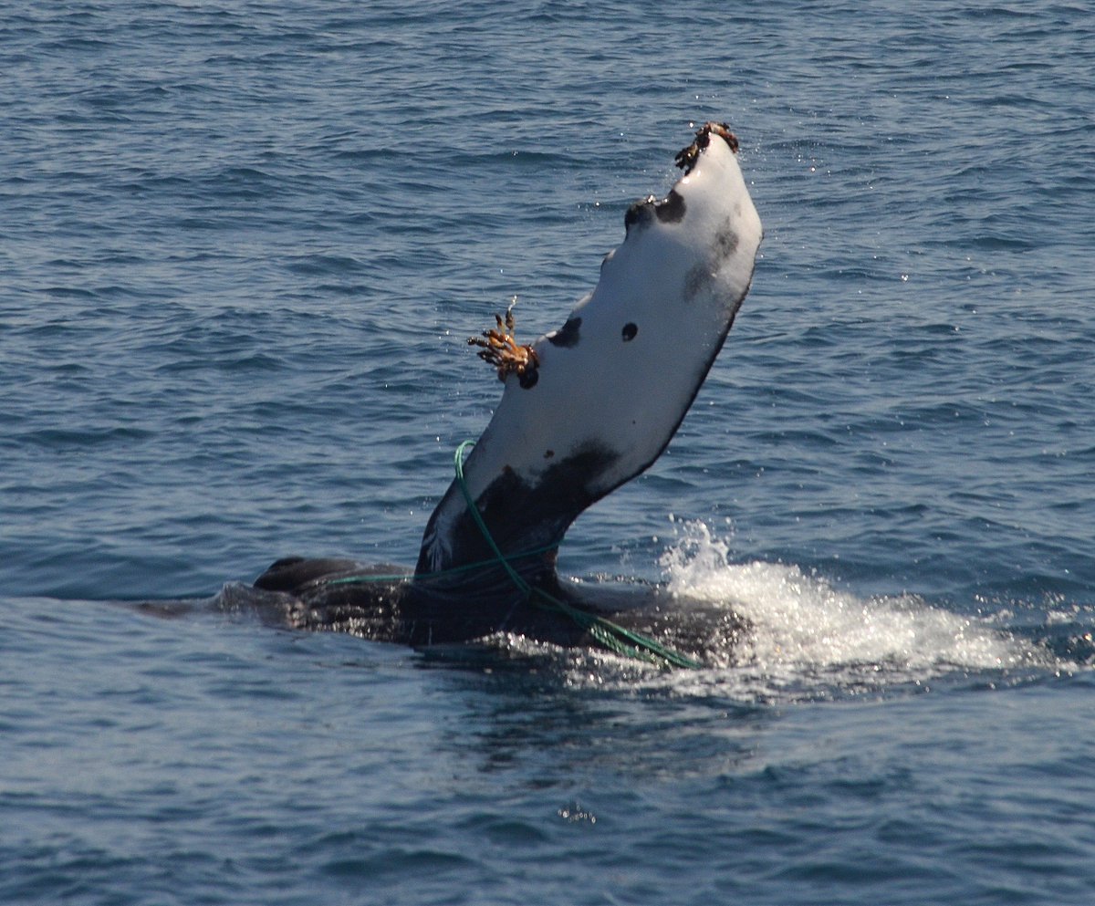 Have you seen this whale?! Keep an eye out for this Humpback - tangled in green fishing gear around the head and left flipper