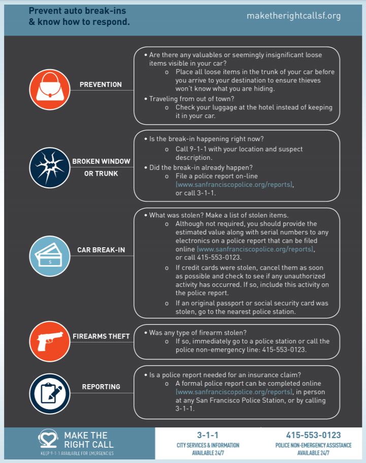 “Make the Right Call” preventing auto burglaries and knowing how to respond with this nifty, quick-reference flier from